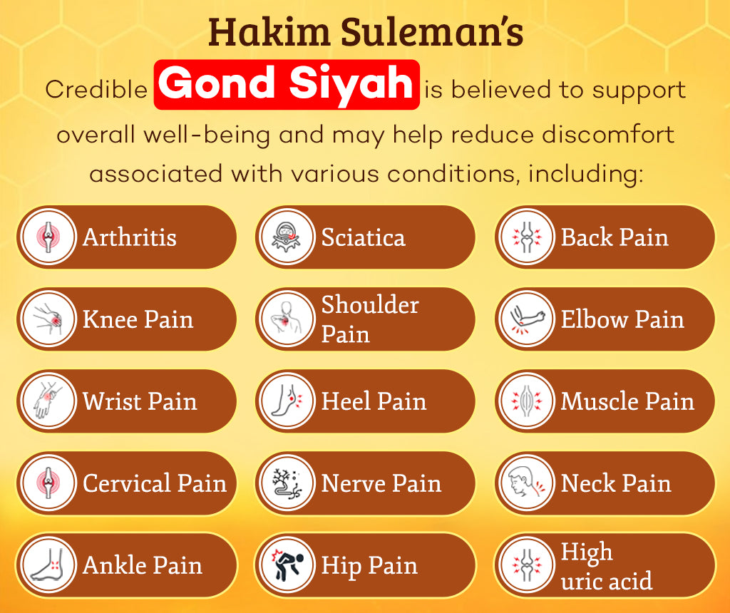 In addition to alleviating pain-related issues, Kala Gond is considered a valuable preventive measure against such complications. Moreover, it is believed to aid in reducing elevated uric acid levels in the body and is seen as beneficial for sciatica. To sum it up, Gond Siyah is viewed as a comprehensive solution for managing and preventing overall body discomfort.